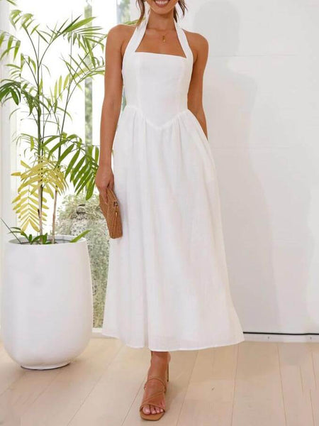 Elevate your elegance with our halterneck midi dress! That's why you'll love it, the halter neckline and fitted bodice create a flattering, sophisticated silhouette that's perfect for any special occasion. Whether you're attending a wedding, a cocktail party, or a fancy dinner, this dress is the epitome of timeless elegance.