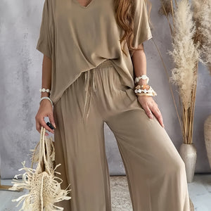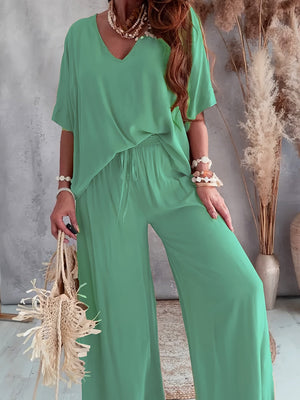 The wide-leg pants offer a flattering, elongating shape, while the V-neck top adds a hint of casual charm. Whether you're heading out for coffee, working from home, or catching golden hour with friends, Nina brings understated confidence to any look.
