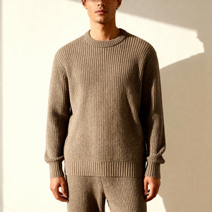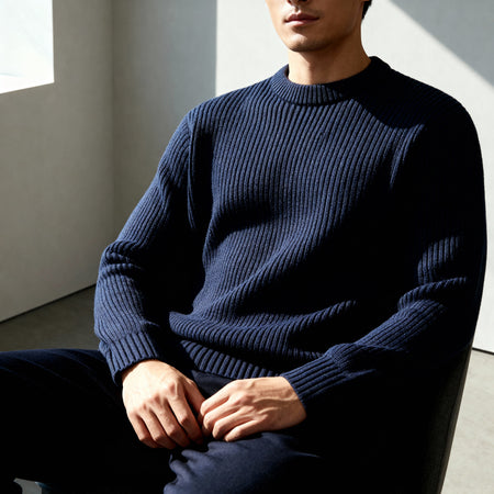 Understated, structured, and refined, the Soren Rib Sweater blends modern craftsmanship with timeless design. Featuring a parallel weave rib pattern, each fine vertical rib is subtly linked by ultra-thin horizontal threads, forming a smooth woven texture that diffuses light softly across the surface. The result is a balanced expression of depth, precision, and minimalism.
